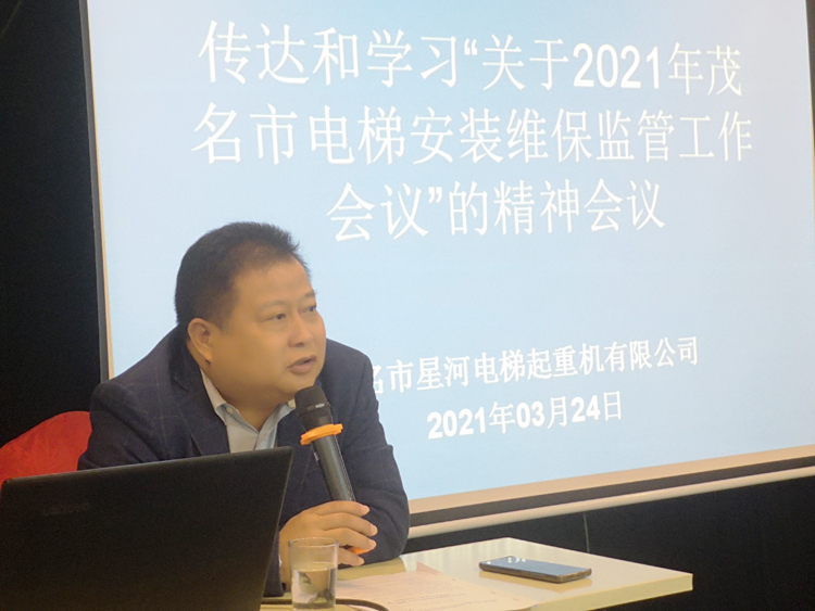 3月24日胡永忠總經(jīng)理 (下簡稱:胡總) 帶領(lǐng)公司重要管理層、工程維保兩大部門一線安裝組長、維保站長在茂名市油城十路三樓會議室共同學(xué)習(xí)茂名市市場監(jiān)督管理局文件(編號:茂市監(jiān)[2021]48號)“關(guān)于加強(qiáng)電梯維保單位備案工作的通知”的會議精神。